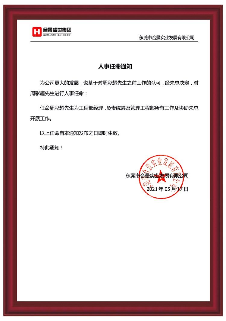 任命周彩超先生為工程部經(jīng)理,負責統(tǒng)籌及管理工程部所有工作及協(xié)助總經(jīng)理開展其他工作。