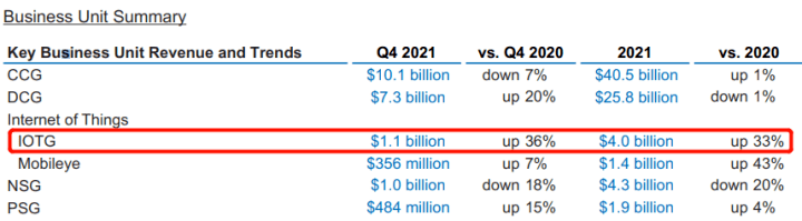 在晶圓代工巨頭臺積電公布的財報中,2021年其手機業(yè)務營收首次被HPC(大型高性能計算)業(yè)務超越,面向汽車板塊的營收和訂單需求也猛增。 圖像傳感器芯片設計龍頭韋爾股份最新財報顯示,其半導體業(yè)務收入同比增長18%,雖然智能手機CMOS占據(jù)營收大頭,但業(yè)績增長主要來源于車載CIS與安防CIS,尤其在安防領域?qū)崿F(xiàn)高達60%的業(yè)績增長。 2021年物聯(lián)網(wǎng)事業(yè)部(IoTG)成為國際半導體巨頭英特爾增長最快的業(yè)務,同比增長33%,同時汽車自動駕駛業(yè)務也增速驚人,反觀主營PC終端的CCG部門業(yè)績僅增1個百分點。